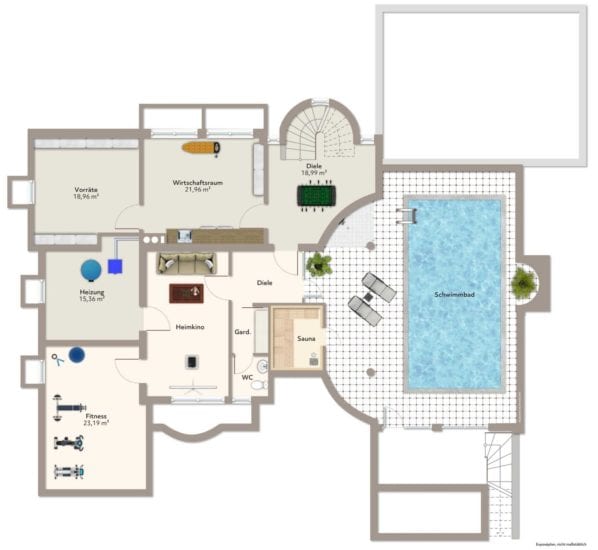 Das Highlight ist der Wellness-Bereich: die ca. 70 m² große und helle Schwimmhalle bietet nicht nur einen Blick und Zugang in den offenen Lichthof, sondern auch eine großzügige Dusche, eine neuwertige Sauna (auch Sanarium) und Platz für Liegen.Viele Möglichkeiten entstehen durch die zusätzliche Einliegerwohnung im Erdgeschoss. Diese ist rd. 45 m² groß und verfügt über einen eigenen Eingang, ist jedoch mit einer massiven Tür auch mit der Villa direkt verbunden.