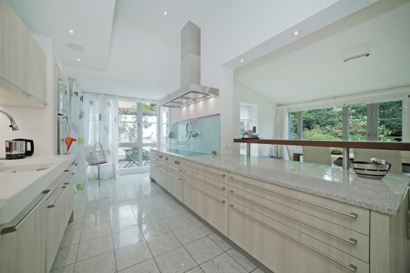 Leicht-Einbauküche, Modernisierung 2010: Arbeitsplatte Granit imperial white, Gaggenau Geräte-Turm mit Backofen, Dampfbackofen und Wärmeschublade. Gaggenau Vario-Induktionskochfeld und Vario-Induktionswok, Dunstabzug 150 cm breit, Abluft nach außen, Miele Geschirrspüler und vieles mehr.Die Bäder