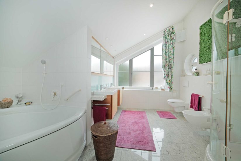 Masterbad mit Eckbadewanne, Dusche, WC, Bidet und modernisierter Waschtischanlage mit Milchglasverkleidung und Einbau-Spiegelschrank.