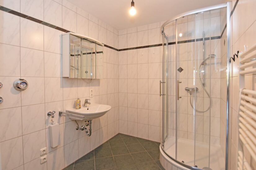 + geräumiges, freundlich gefliestes Bad mit Dusche, Waschbecken, Handtuchheizkörper und Waschmaschinenanschluss