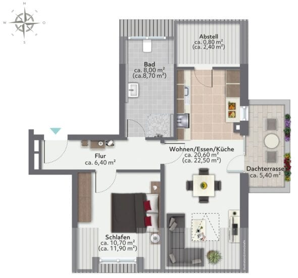 Die bereits eingeplante Ausstattung wird Sie begeistern. So gehören u.a. hochwertige Parkettböden, eine wohltuende Fußbodenheizung, dezentrale Be- und Entlüftungsanlagen mit Wärmerückgewinnung, langlebige Kunststoff-/Alu-Fenster, komfortable elektrische Rollläden sowie eine formschöne und umfangreiche Bad- und Elektroausstattung zum exklusiven Standard. Ihre individuelle Ausstattung können Sie selbstverständlich in den Räumen des Bauträgers bemustern.Die kompakt und gut geschnittene Wohnung Nr. 6 befindet sich im Dachgeschoss. Sie verfügt über einen Eingangsbereich mit Platz für eine Garderobe, ein Tageslicht-Badezimmer mit komfortabler Dusche, Waschbecken und WC, ein gut möblierbares Schlafzimmer sowie ein helles Wohnzimmer mit offener Küche und praktischer Abstellkammer. Über das Wohnzimmer gelangen Sie auf die schöne Dachterrasse mit Blick über die Nachbarschaft.