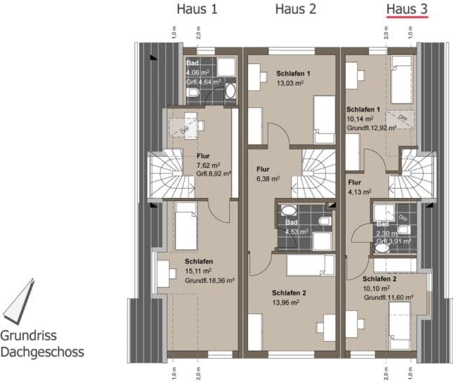 Bei den angegebenen Wohnflächen sind die Terrassen, die Hobbyräume und Flure im Kellergeschoss mit 1/2 ihrer Grundfläche enthalten. Bei den Dachgeschossflächen sind die Bereiche mit einer Raumhöhe von 0 - 1 m nicht, von 1 - 2 m zu 1/2 und ab 2 m-Raumhöhe vollständig enthalten.